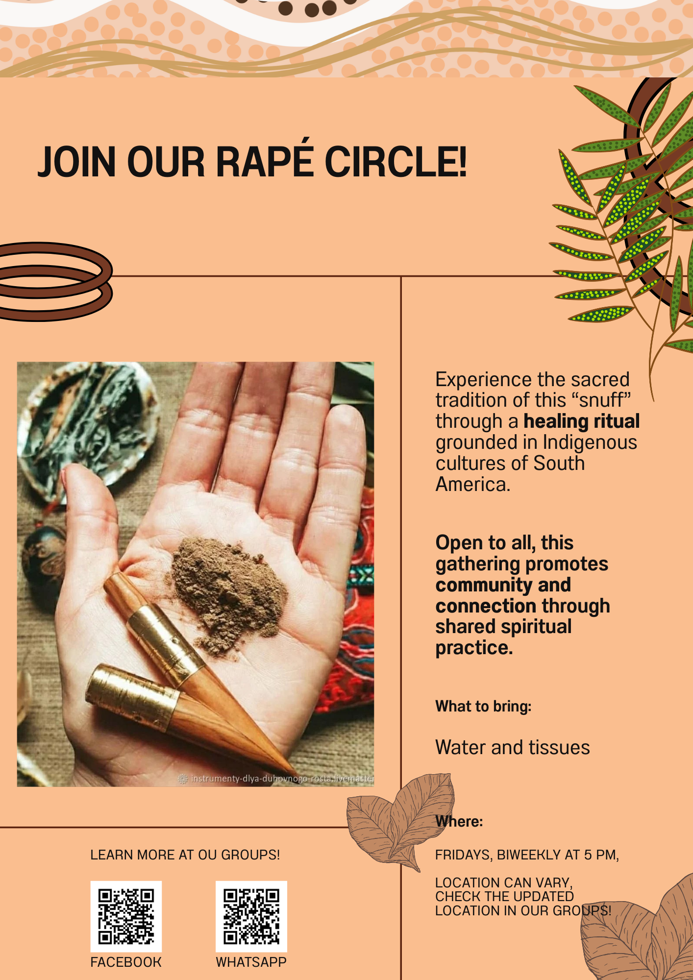 Since 2024, the circles have been held bi-weekly on Friday evenings, either within the University of Ottawa premises or at Strathcona Park, weather permitting. We initially began with a small group of students who were already familiar with the medicine (rapé) and who were willing to share with others some of their spiritual practices and learnings in ways that honour Indigenous traditions. Willing to enrich the group and community experience, the circles are open to any community member interested in having an experience with the medicine of the forest.